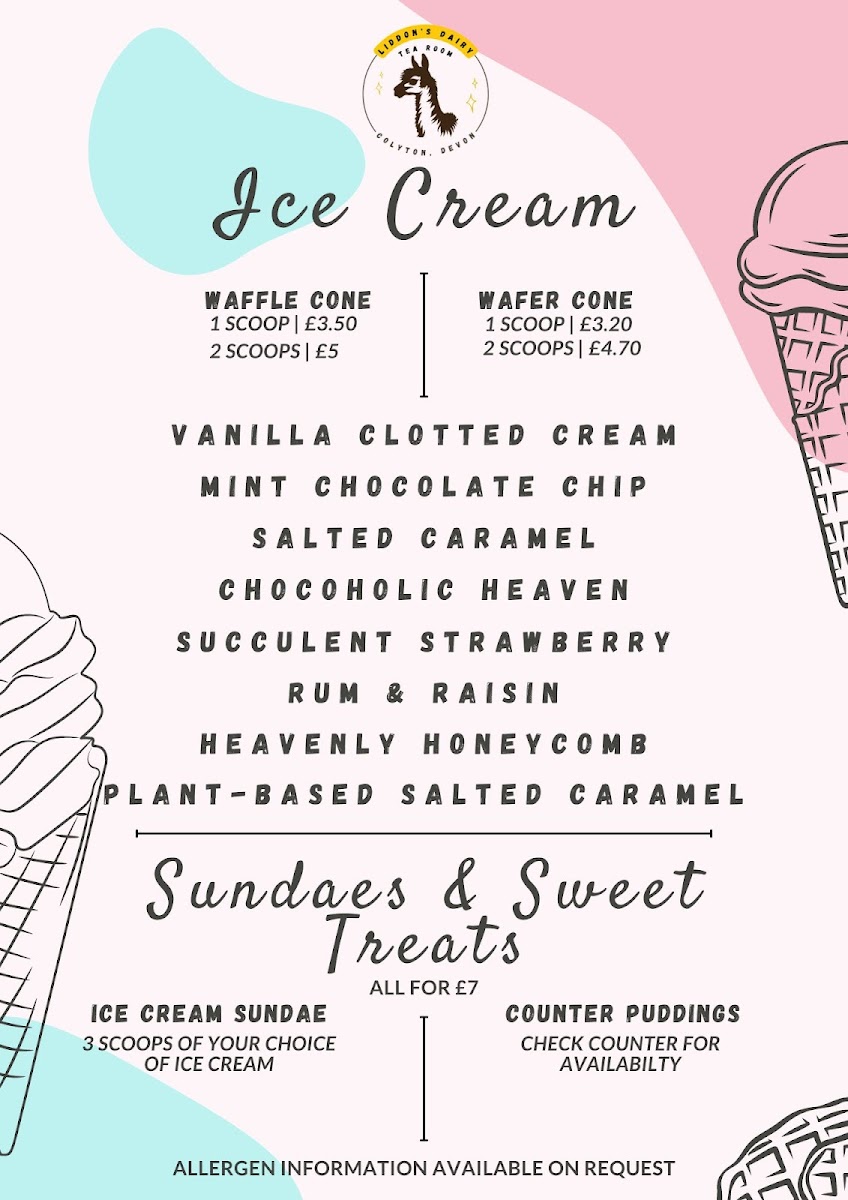 Welcome to Liddons Dairy Tea Room, a quaint café nestled in the charming town of Colyton. This delightful spot offers a menu that caters to all tastes, featuring a range of cold drinks, delicious ice creams, and tempting treats.